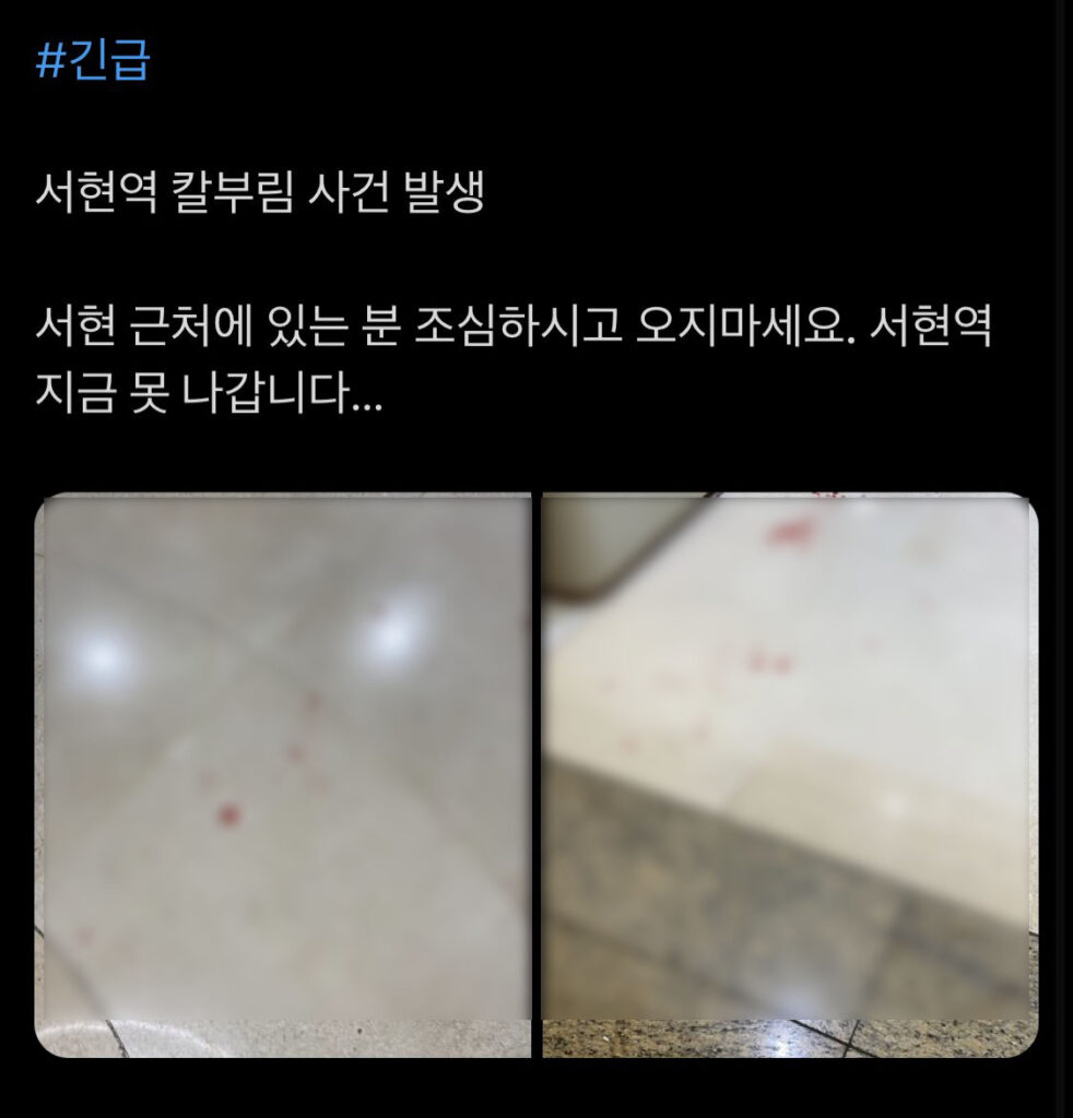 이슈 서현역 묻지마 칼부림 사건 발생 피의자 2명 중 1명은 긴급체포 신림역 묻지마 칼부림 사건이 잊혀지기도 전에 또 다시 묻지마 칼부림 사건이 발생했다. 3일 오후 6시 쯤 경기 성남구 분당구 수인분당선 서현역 AK플라자 분당에서 묻지마 칼부림 사건이 발생했다.피의자는 총 2명으로 승합차로 서현역을 배회 하던 도중 차에서 내려 4명을 찔렀다고 한다.그 후 다시 차를 탄 뒤 버스정류장 인도를 넘어 서현역 AK플라자로 돌진했다. 차에서 내린 피의자는 서현역을 배회하며 지나가는 사람들을 무차별 적으로 찔렀으며 12명의 사상자를 냈다.피해자 3명은 병원으로 긴급 이송 되었으며 피해자 중 한명은 사망했다고 한다.사건 당시 119에는 “남자가 사람을 찌르고 다닌다”는 내용의 신고가 접수된 것으로 파악됐으며 경찰과 소방당국이 현장에 도착해 피의자 1인을 체포했다. 경찰 관계자는 “피해 현황과 정확한 범행 경위 등을 확인중”이라고 전했으며 범행에 가담한 피의자 1명은 추격중이라고한다.전문가들은 이 범행을 2주전 발생한 신림역 묻지마 칼부림 사건의 오마주로 보고 있으며 신림역 칼부림 사건 이후로 해당 사건의 모방범죄가 7건이나 달한다고 전했다.SNS 등에서는 해당 사건을 보고 묻지마칼부림 사건이 아닌 테러 사건으로 봐야한다며 두려움에 떨고 있다. 관련 기사 제보 및 삭제요청issuetory@gmail.com