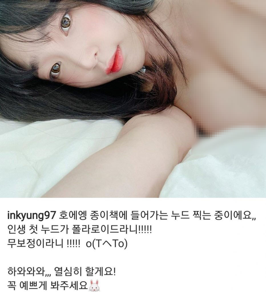 당시 강인경 인스타그램에는 상의를 모두 벗은 셀카 사진이 올라왔다. 강인경은 “종이책에 들어가는 누드 찍는 중이에요. 인생 첫 누드가 폴라로이드라니. 무보정이라니. 꼭 예쁘게 봐주세요”라고 누드 화보 소식을 알렸다.