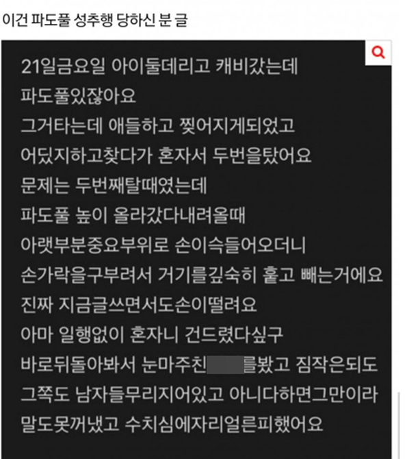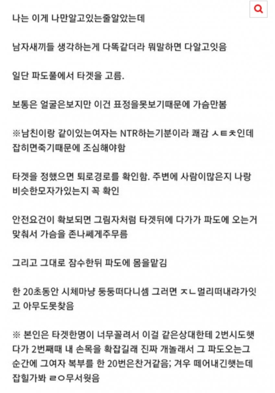 이슈 “워터파크에서 안걸리고 만지는 방법” 커뮤니티에서 유행하고 있다는 성추행 방법 캐리비안베이를 비롯 실내 대형 수영장에 성추행 방법을 공유하는 게시물이 등장해 누리꾼들을 충격에 빠트리고 있다. 31일 인기 온라인 커뮤니티 ‘디시인사이드’에는 ‘파도풀 가는 사람 조심해 성추행 많나봐’라는 제목의 게시물이 올라왔다.해당 게시물에는 파도풀에 성추행범이 최근 많다는 글과 함께 한 누리꾼이 올린 파도풀에서 성추행 하는 방법이 공유됐다.게시물의 내용에는 “(파도풀에서 성추행하는 팁) 나만 알고 있는 줄 알았는데 남자들 하는 생각들 다 똑같더라”라고 적혀 있었다. 이어서 게시물에는 “일단 파도풀에서 타겟을 고른 다음에 퇴로 경로를 확인함.주변에 사람 수랑 비슷한 수영모를 꼭 확인해라”며 “안전요건이 확보되면그림자처럼 다가가 파도에 오는거 맞춰서 가슴을 존X 쎄게 주물러라”고 했다.그 뒤 “그리고 그대로 잠수한 다음에 파도에 몸을 맡겨라.한 20초 동안 시체 마냥 둥둥 떠다니면 멀리 떠내려가 있어서 아무도 못 찾는다”고 했다. 이외에 피해자들에 대한 글도 올라왔다. 자신을 두 아이의 엄마라고 소개한 글쓴이는“아이 둘을 데리고 캐리비안베이에 갔는데 파도풀이 높이 올라갈 때 아랫부분 중요 부위에손이 슥 들어오더니 손가락을 구부려서 거기를 깊숙이 훑고 뺐다”고 했다. 관련 기사 제보 및 삭제요청issuetory@gmail.com